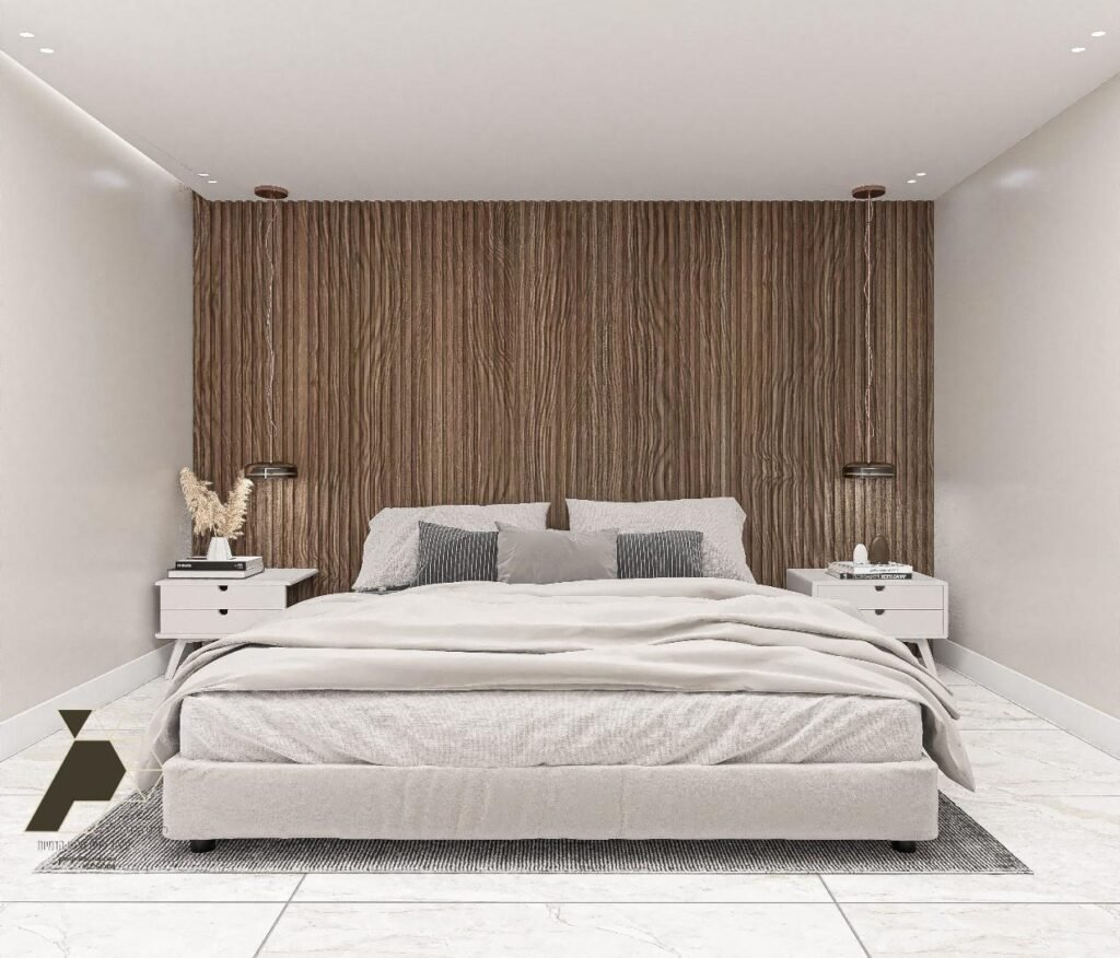 חיפוי קיר חלק לראש מיטה, המשלב שני סוגי חיפויים שונים, יוצר מראה אלגנטי עם נוכחות מובהקת בחלל.